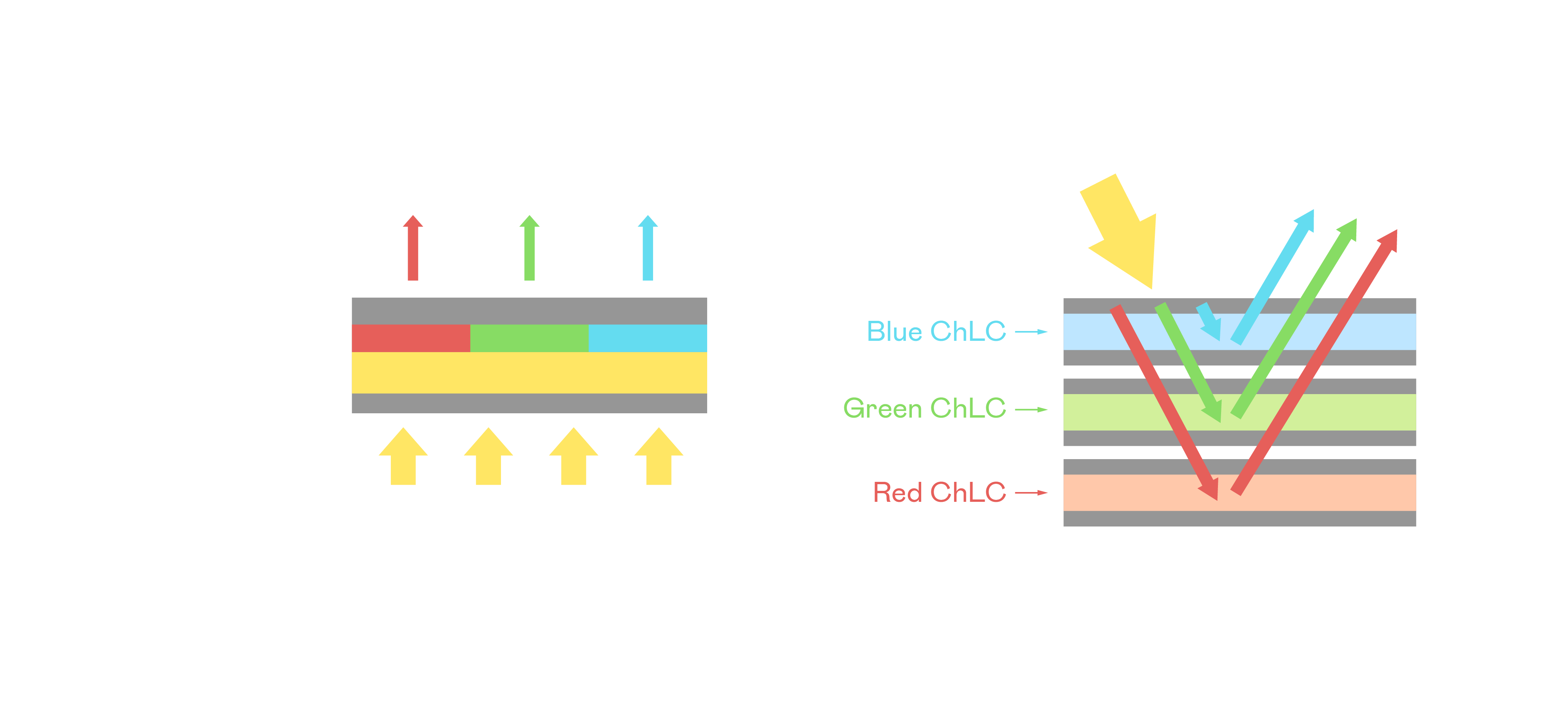 万博胆固醇液晶显示器是由红、绿、蓝三层胆固醇液晶面板堆叠而成,并采用无彩色滤光片设计,减少环境光在反射过程中的损耗。